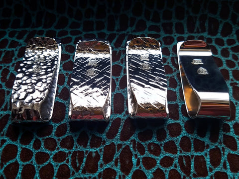A creation of mine is the Contour Cut Series featuring an upper contouring on the back of these money clips. It is a unique look I hand make in Ball-peen Hammered, Criss-cross Ridge Hammered, Diagonal Ridge Hammered, and Sleek.